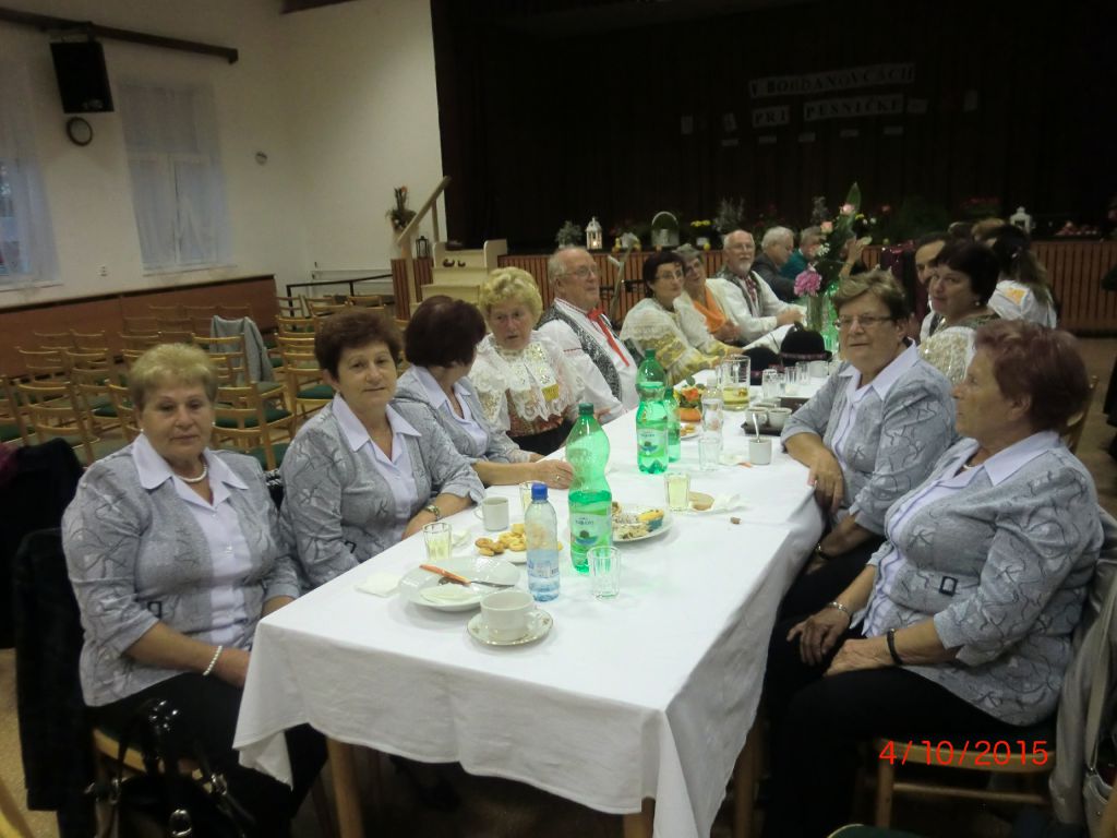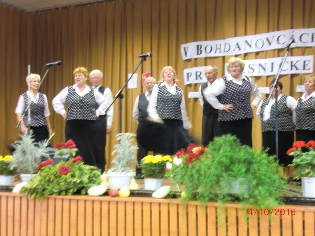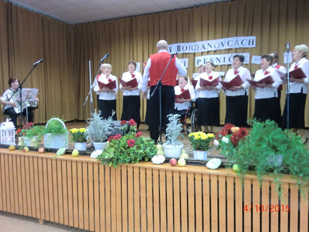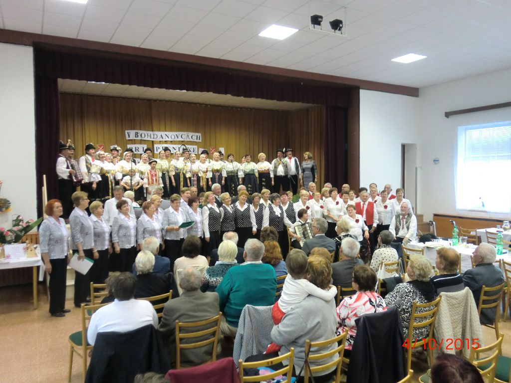 Posedenie pri ľudovej piesni „V Bohdanovcách pri pesničke“ (04.10.2015) Najmä členovia našej ZO JDS sa pričinili o pekné spevavé popoludnie pri ľudovej piesni v kultúrnom dome. Privítali sme folklórne spevácke skupiny: Dolina zo Šelpíc, Dolnoorešanku z Dolých Orešian, Rošindolčanov z Ružindola a Špačinčanku zo Špačiniec. Pozývateľom bol náš súbor Bohdanovčan, ktorý sa predstavil svojimi piesňami a tancami, čím rozveselil všetkých prítomných. Vďaka patrí pánovi starostovi, kultúrnej komisii a členkám Seniorklubu, ktorí prispeli svojou nezištnou prácou k úspešnej akcii našej obce.