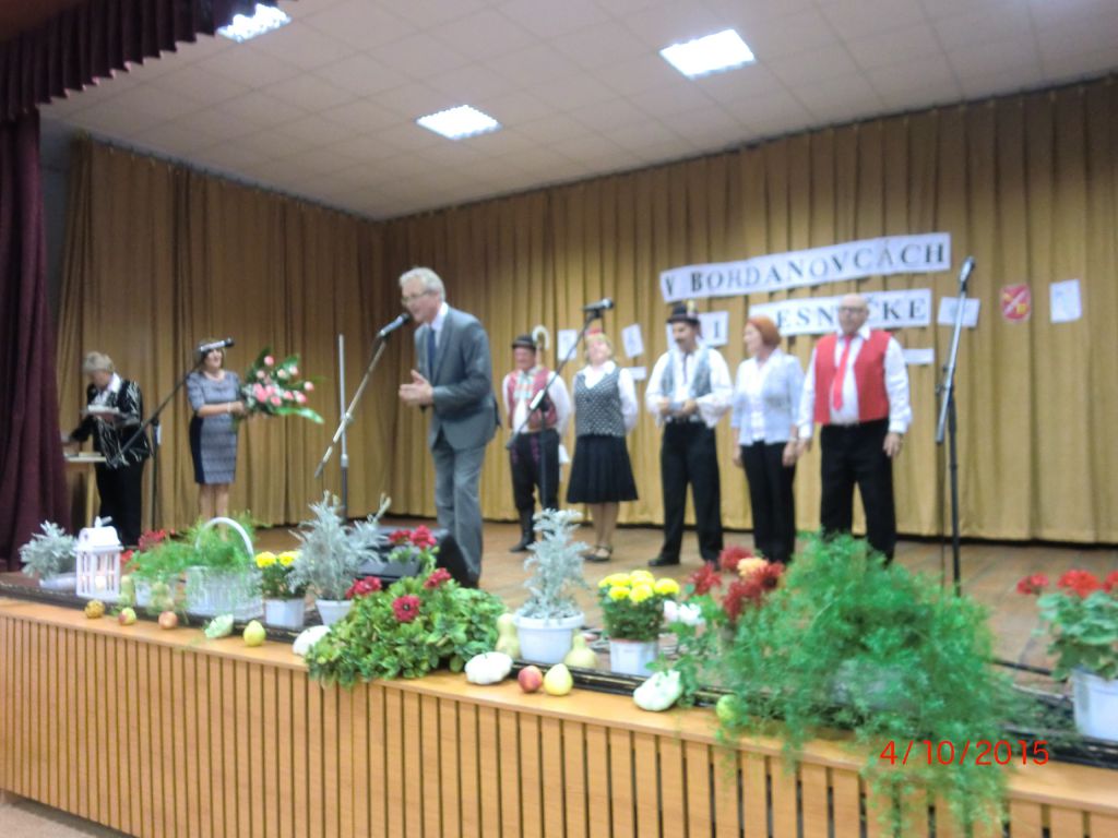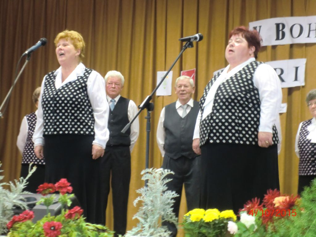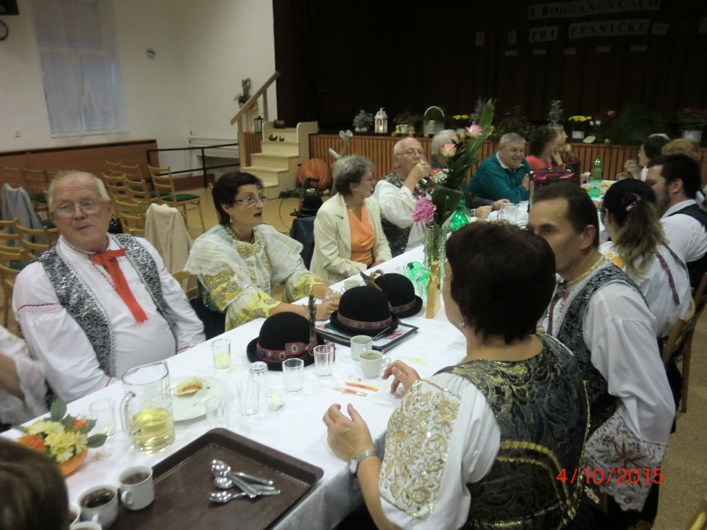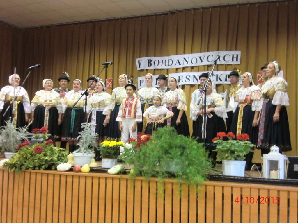 Posedenie pri ľudovej piesni „V Bohdanovcách pri pesničke“ (04.10.2015) Najmä členovia našej ZO JDS sa pričinili o pekné spevavé popoludnie pri ľudovej piesni v kultúrnom dome. Privítali sme folklórne spevácke skupiny: Dolina zo Šelpíc, Dolnoorešanku z Dolých Orešian, Rošindolčanov z Ružindola a Špačinčanku zo Špačiniec. Pozývateľom bol náš súbor Bohdanovčan, ktorý sa predstavil svojimi piesňami a tancami, čím rozveselil všetkých prítomných. Vďaka patrí pánovi starostovi, kultúrnej komisii a členkám Seniorklubu, ktorí prispeli svojou nezištnou prácou k úspešnej akcii našej obce.