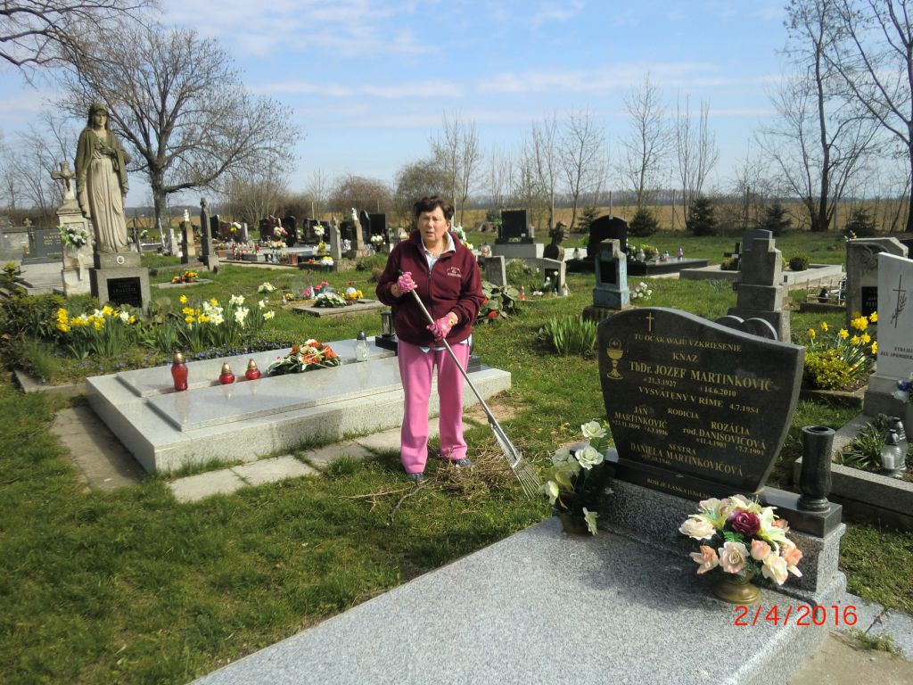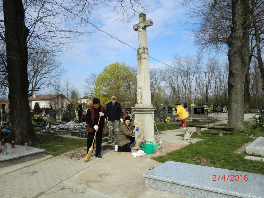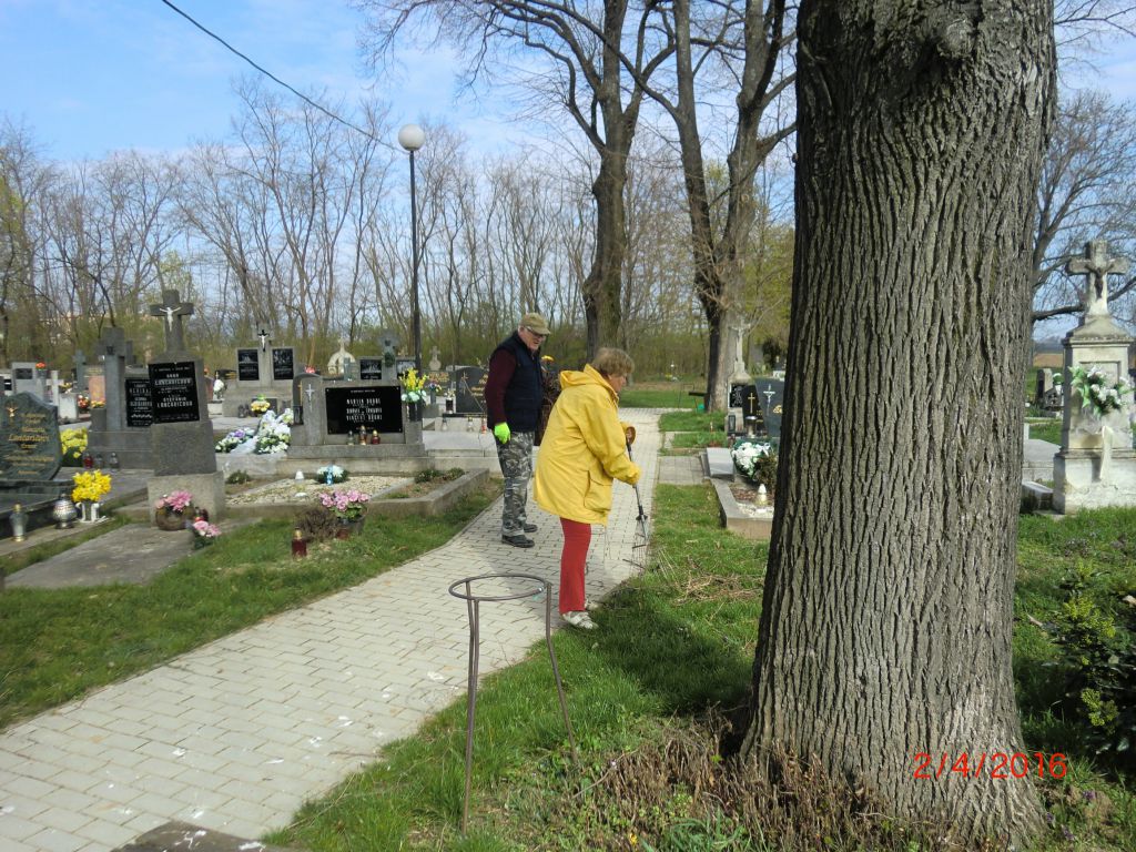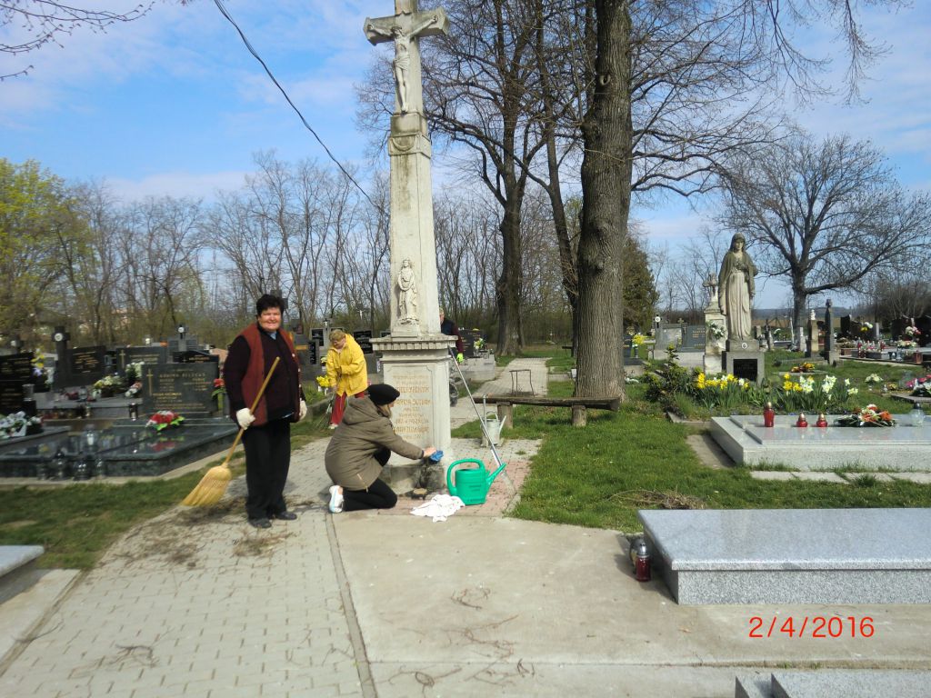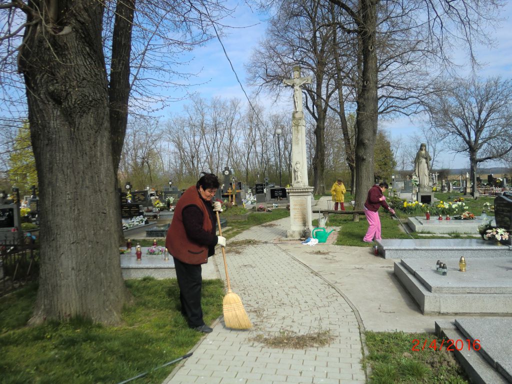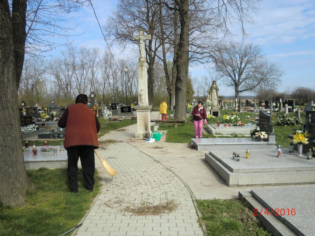 Upratovanie okolia kostola a cintorína - (02.04.2016) – Aj naši niektorí členovia sa zapojili do jarného upratovania obce, prispeli najmä k vyčisteniu okolia chodníkov na cintoríne, očistili kríž od zhorených sviečok, vyhrabali napadané haluze a vyčistili a zamietli chodníky. Škoda, že sa nezapojilo viac členov ZO JDS.