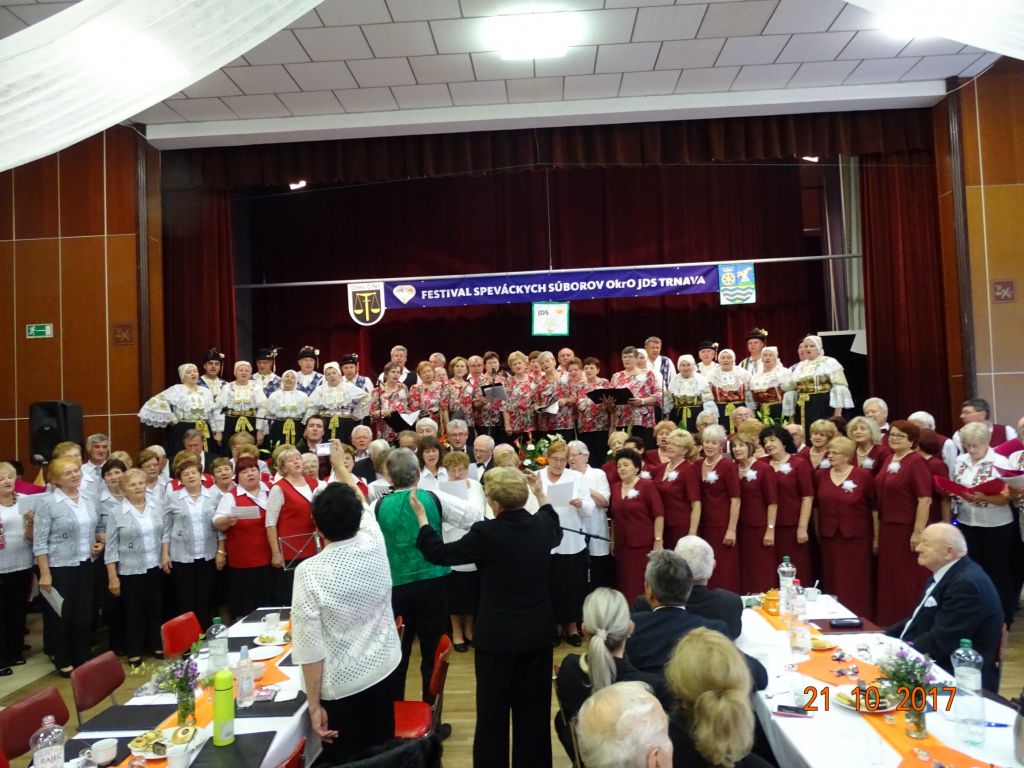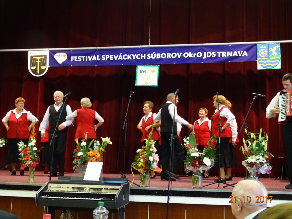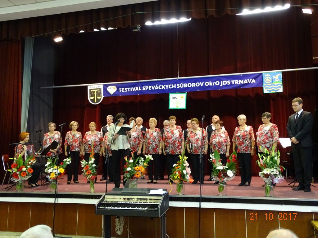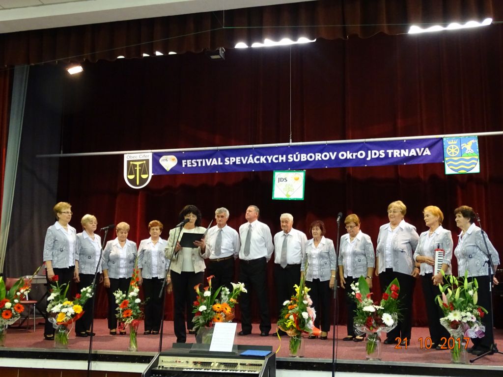 Festival speváckych súborov seniorov okresu Trnava –Cífer (21.10.2017) V peknom prostredí kultúrneho domu v Cíferi sa uskutočnil už XIV. ročník prehliadky speváckych súborov okresu Trnava. Festival pozdravili i zástupcovia samosprávneho kraja Trnava a predstavili sa súbory Blavanka z Jaslovských Bohuníc, Jesienka z Trnavy, súbor Dolina zo Šelpíc, spevácky súbor Kvítek z Břeclavi v ČR, náš spevácky súbor Bohdanovčan, Cíferský spevácky zbor a spevácky súbor Prameň z Voderád. Poďakovanie patrilo všetkým, ktorí so zanietením a radosťou interpretujú naše krásne ľudové piesne.