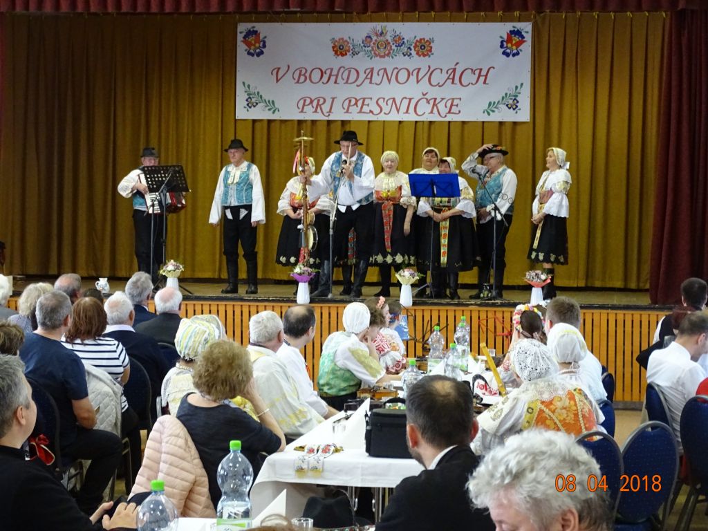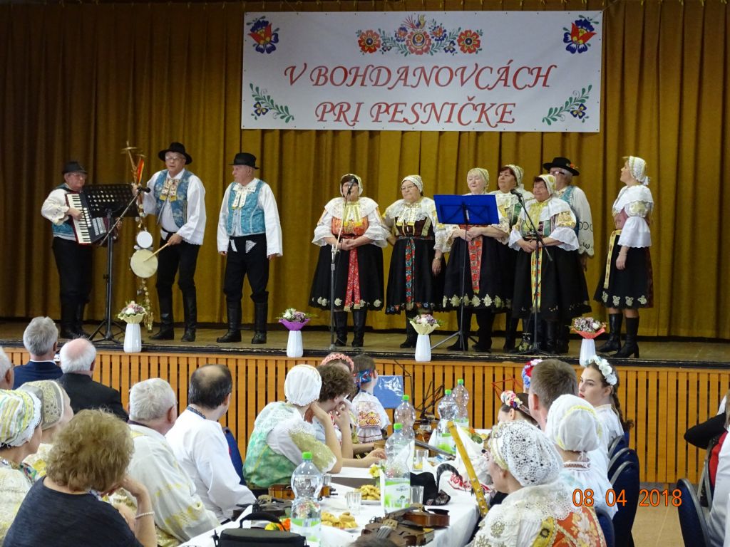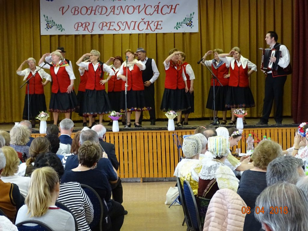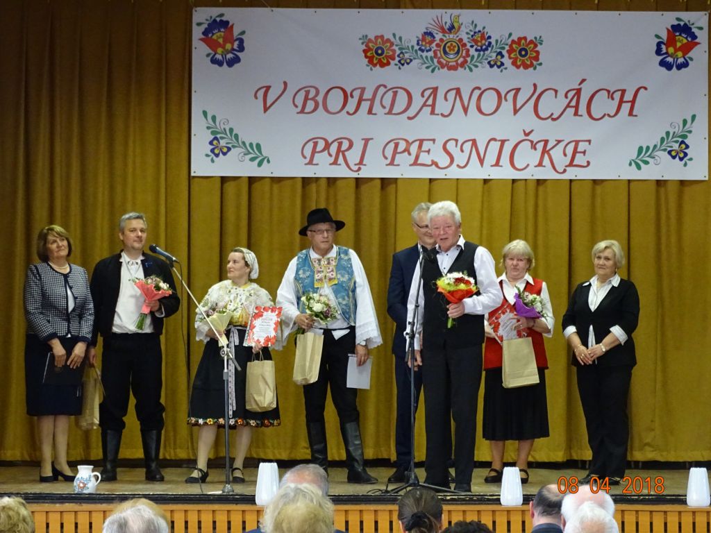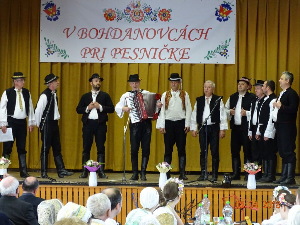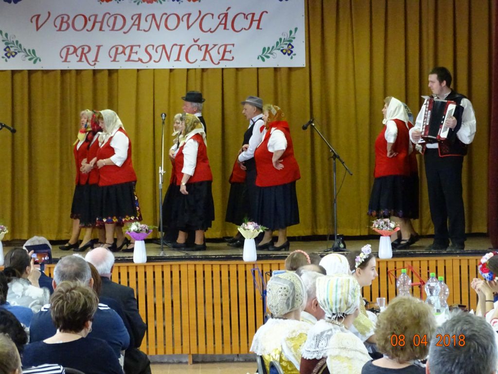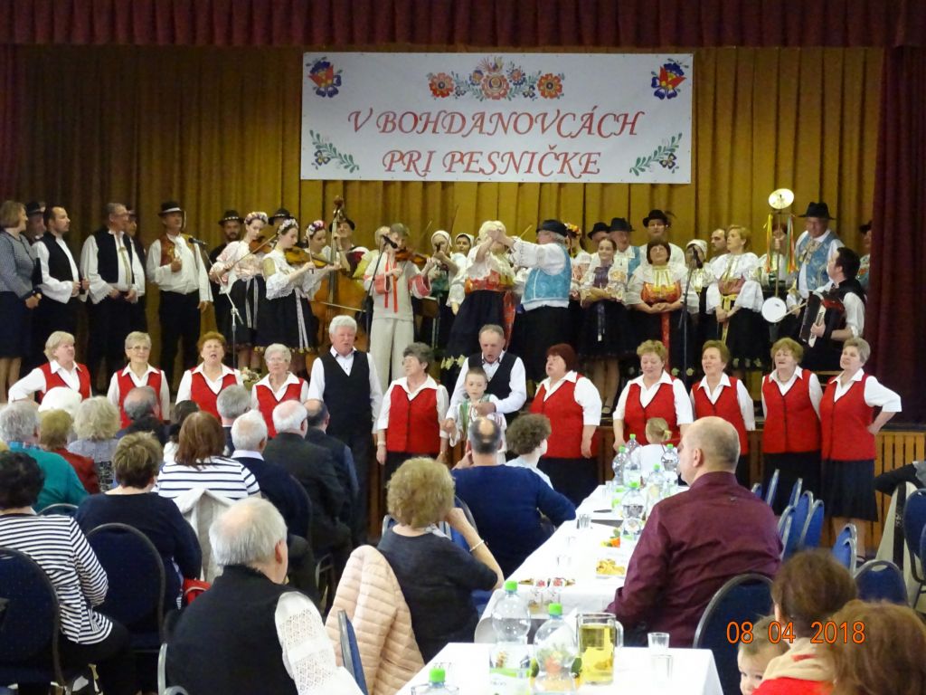„V Bohdanovcách pri pesničke“ (08.04.2018) Posedenie pri ľudovej piesni zorganizovali FS Bohdanovčan v spolupráci s OcÚ a jeho kultúrnou komisiou a ZO JDS Seniorklub. Kultúrny dom sa zaplnil do posledného miestečka a bolo sa na čo pozerať. Na podujatí vystúpil najprv domáci súbor Bohdanovčan, ktorý prekvapil 3 krátkymi pásmami: šaty robia človeka – predviedli sa v oblečení našich starých mám, a potom vo svojich pekných kostýmoch, predviedli scénku zo života vdov a krásné bolo pásmo piesní o vínečku. Folklórna spevácka skupina Seniorklub z Opoja sa predviedla v krásnych trnavských krojoch a zaspievala veselé aj smutné piesne v trnavskom nárečí. Mužská spevácka skupina Záruby zo Smoleníc sa predstavila piesňovým pásmom o Českej ceste “Via Bohemica” pod názvom “Ked sme prechádzali z Uher do Moravy…”.Ich vystúpenie ocenilo obecenstvo veľkým potleskom. Veselé bolo vystúpenie detskej ľudovej hudby Brezinka a ľudovej hudby Brezina z Boleráza, ktorí sa predstavili piesňami z Malatinej a blokom piesní pod názvom “Žartovné z Boleráza a Orešán”. V záverečnej časti si všetci účinkujúci spolu s obecenstvom zaspievali známe ľudové piesne. Potom pán starosta s predsedníčkou kultúrnej komisie a predsedníčkou ZO JDS odovzdali vedúcim hosťujúcich FS spomienkové darčeky na dnešné popoludnie. Pán Ján Klimo odovzdal starostovi obce kroniku speváckeho súboru, ktorý pôsobil v obci v 70-tych rokoch. Ďakujeme všetkým, ktorí prispeli ku krásnemu nedeľnému popoludniu, ale najmä tým, ktorí obetujú svoj voľný čas a uchovávajú ľudové tradície pre ďalšie generácie.