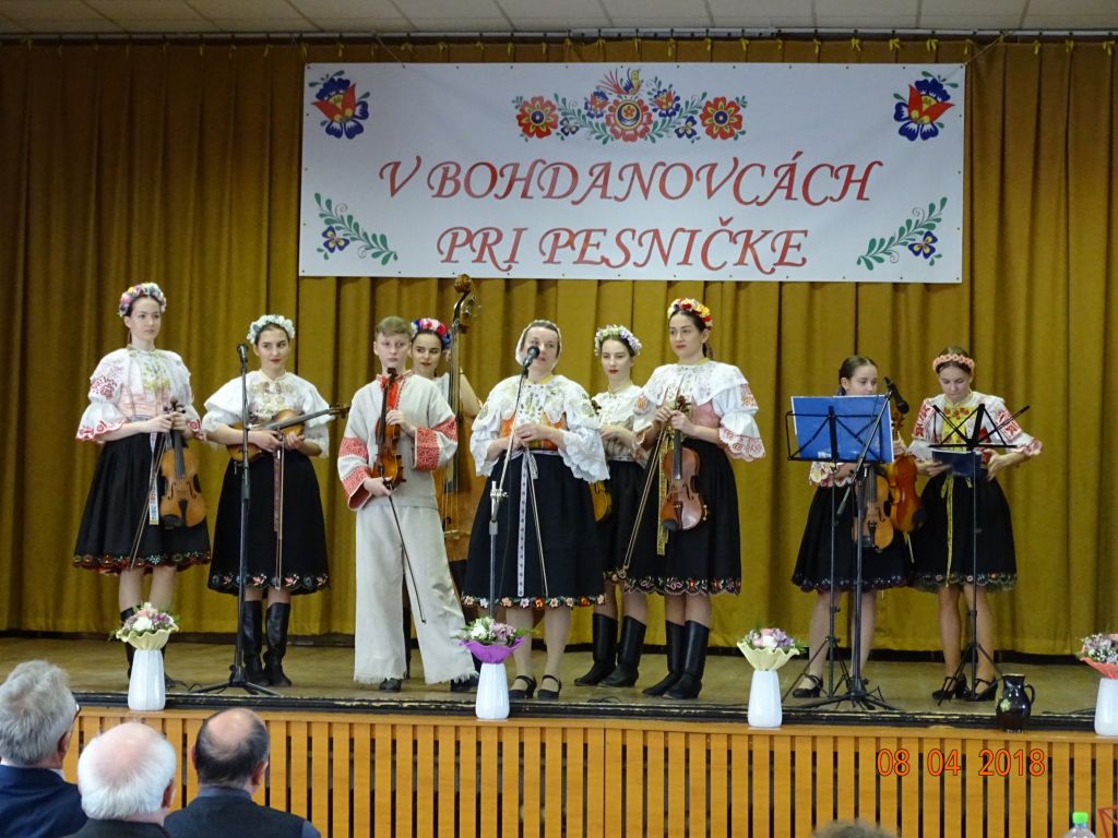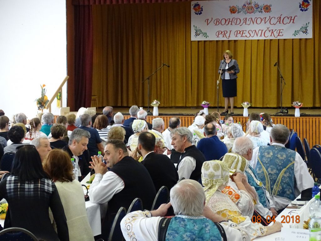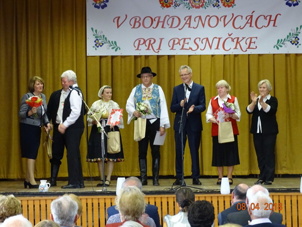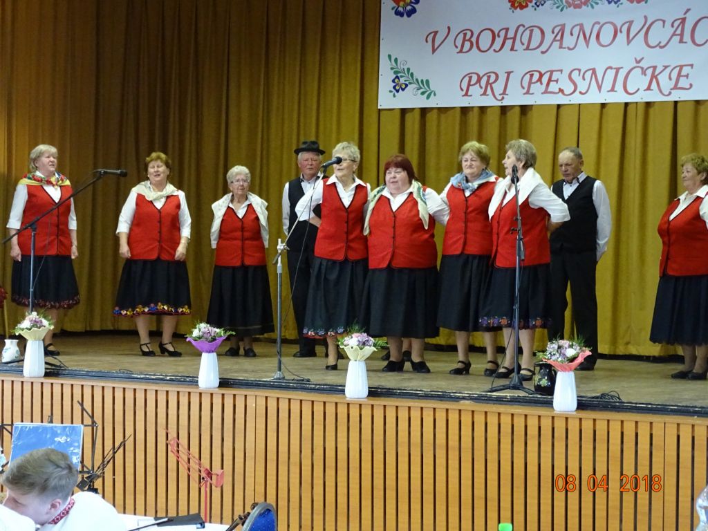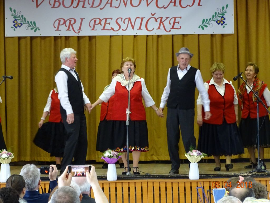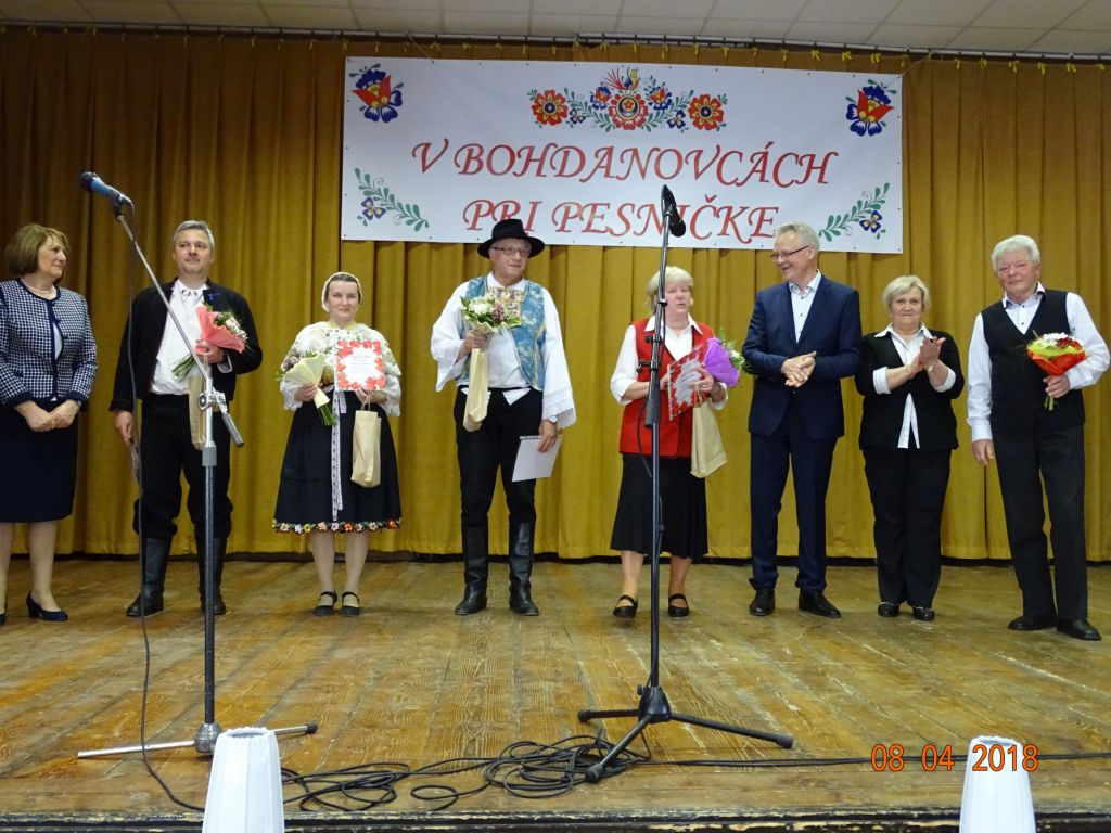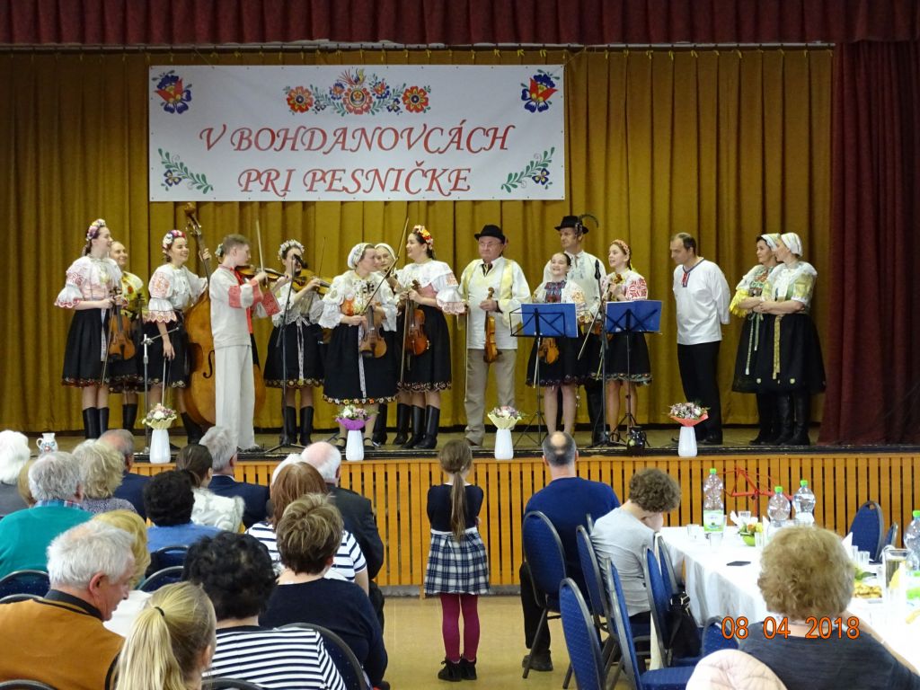 „V Bohdanovcách pri pesničke“ (08.04.2018) Posedenie pri ľudovej piesni zorganizovali FS Bohdanovčan v spolupráci s OcÚ a jeho kultúrnou komisiou a ZO JDS Seniorklub. Kultúrny dom sa zaplnil do posledného miestečka a bolo sa na čo pozerať. Na podujatí vystúpil najprv domáci súbor Bohdanovčan, ktorý prekvapil 3 krátkymi pásmami: šaty robia človeka – predviedli sa v oblečení našich starých mám, a potom vo svojich pekných kostýmoch, predviedli scénku zo života vdov a krásné bolo pásmo piesní o vínečku. Folklórna spevácka skupina Seniorklub z Opoja sa predviedla v krásnych trnavských krojoch a zaspievala veselé aj smutné piesne v trnavskom nárečí. Mužská spevácka skupina Záruby zo Smoleníc sa predstavila piesňovým pásmom o Českej ceste “Via Bohemica” pod názvom “Ked sme prechádzali z Uher do Moravy…”.Ich vystúpenie ocenilo obecenstvo veľkým potleskom. Veselé bolo vystúpenie detskej ľudovej hudby Brezinka a ľudovej hudby Brezina z Boleráza, ktorí sa predstavili piesňami z Malatinej a blokom piesní pod názvom “Žartovné z Boleráza a Orešán”. V záverečnej časti si všetci účinkujúci spolu s obecenstvom zaspievali známe ľudové piesne. Potom pán starosta s predsedníčkou kultúrnej komisie a predsedníčkou ZO JDS odovzdali vedúcim hosťujúcich FS spomienkové darčeky na dnešné popoludnie. Pán Ján Klimo odovzdal starostovi obce kroniku speváckeho súboru, ktorý pôsobil v obci v 70-tych rokoch. Ďakujeme všetkým, ktorí prispeli ku krásnemu nedeľnému popoludniu, ale najmä tým, ktorí obetujú svoj voľný čas a uchovávajú ľudové tradície pre ďalšie generácie.