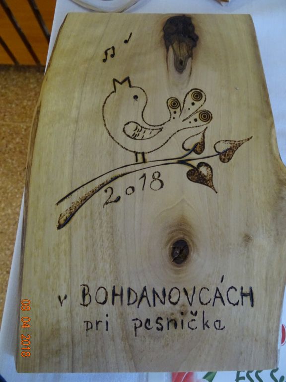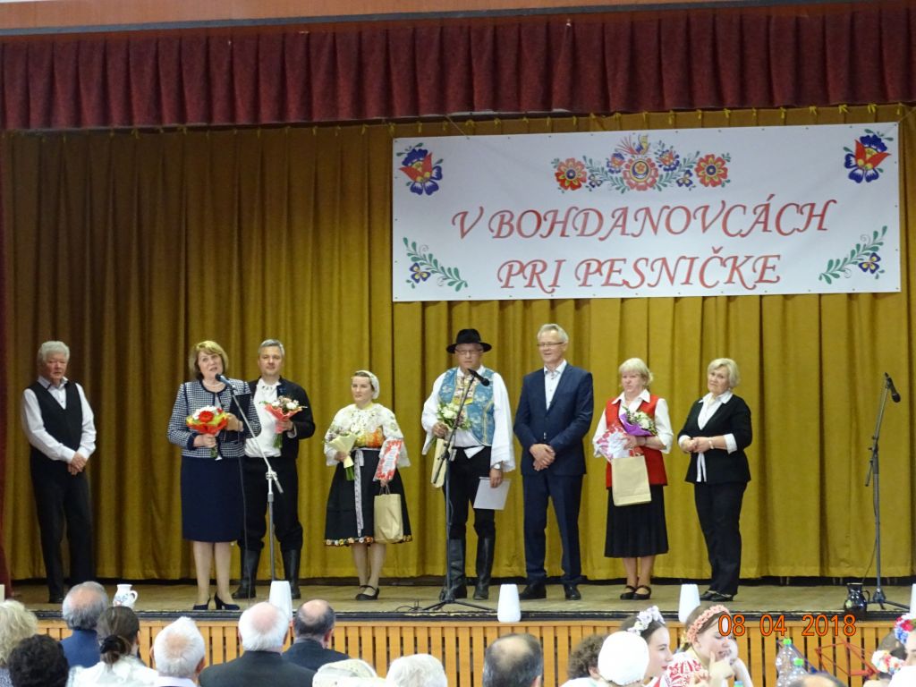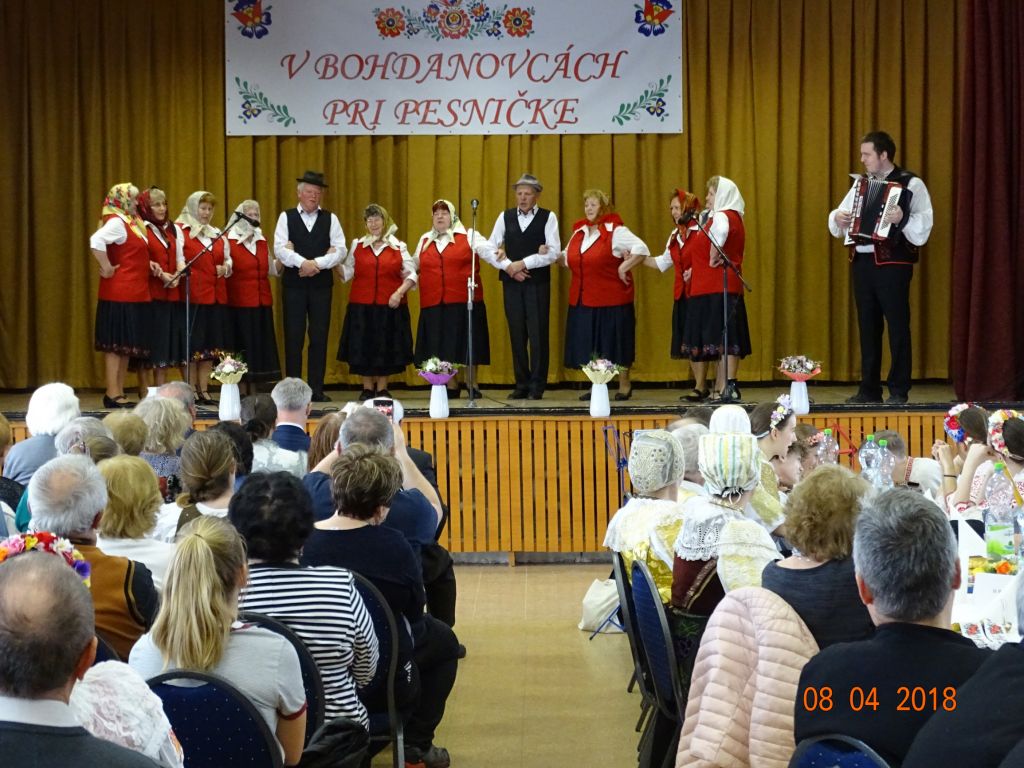 „V Bohdanovcách pri pesničke“ (08.04.2018) Posedenie pri ľudovej piesni zorganizovali FS Bohdanovčan v spolupráci s OcÚ a jeho kultúrnou komisiou a ZO JDS Seniorklub. Kultúrny dom sa zaplnil do posledného miestečka a bolo sa na čo pozerať. Na podujatí vystúpil najprv domáci súbor Bohdanovčan, ktorý prekvapil 3 krátkymi pásmami: šaty robia človeka – predviedli sa v oblečení našich starých mám, a potom vo svojich pekných kostýmoch, predviedli scénku zo života vdov a krásné bolo pásmo piesní o vínečku. Folklórna spevácka skupina Seniorklub z Opoja sa predviedla v krásnych trnavských krojoch a zaspievala veselé aj smutné piesne v trnavskom nárečí. Mužská spevácka skupina Záruby zo Smoleníc sa predstavila piesňovým pásmom o Českej ceste “Via Bohemica” pod názvom “Ked sme prechádzali z Uher do Moravy…”.Ich vystúpenie ocenilo obecenstvo veľkým potleskom. Veselé bolo vystúpenie detskej ľudovej hudby Brezinka a ľudovej hudby Brezina z Boleráza, ktorí sa predstavili piesňami z Malatinej a blokom piesní pod názvom “Žartovné z Boleráza a Orešán”. V záverečnej časti si všetci účinkujúci spolu s obecenstvom zaspievali známe ľudové piesne. Potom pán starosta s predsedníčkou kultúrnej komisie a predsedníčkou ZO JDS odovzdali vedúcim hosťujúcich FS spomienkové darčeky na dnešné popoludnie. Pán Ján Klimo odovzdal starostovi obce kroniku speváckeho súboru, ktorý pôsobil v obci v 70-tych rokoch. Ďakujeme všetkým, ktorí prispeli ku krásnemu nedeľnému popoludniu, ale najmä tým, ktorí obetujú svoj voľný čas a uchovávajú ľudové tradície pre ďalšie generácie.