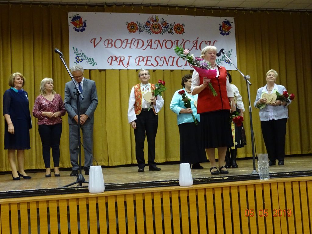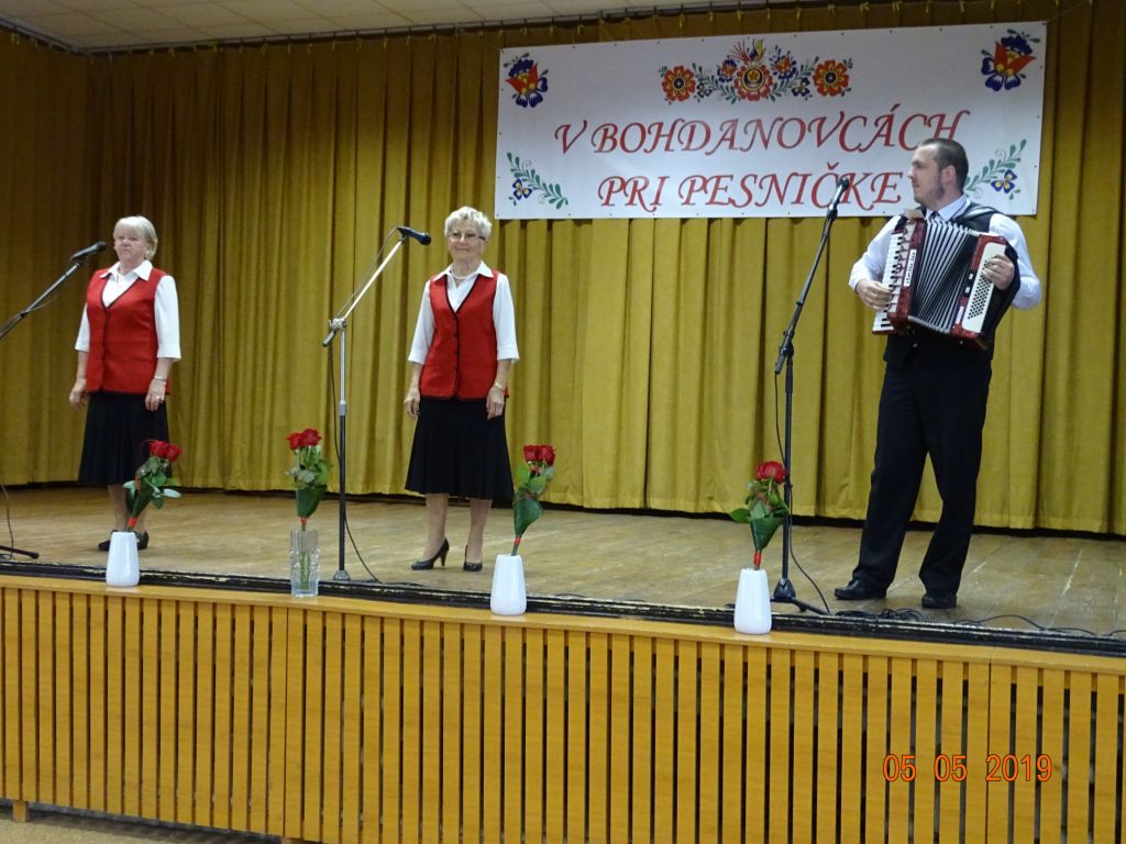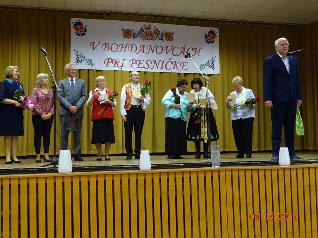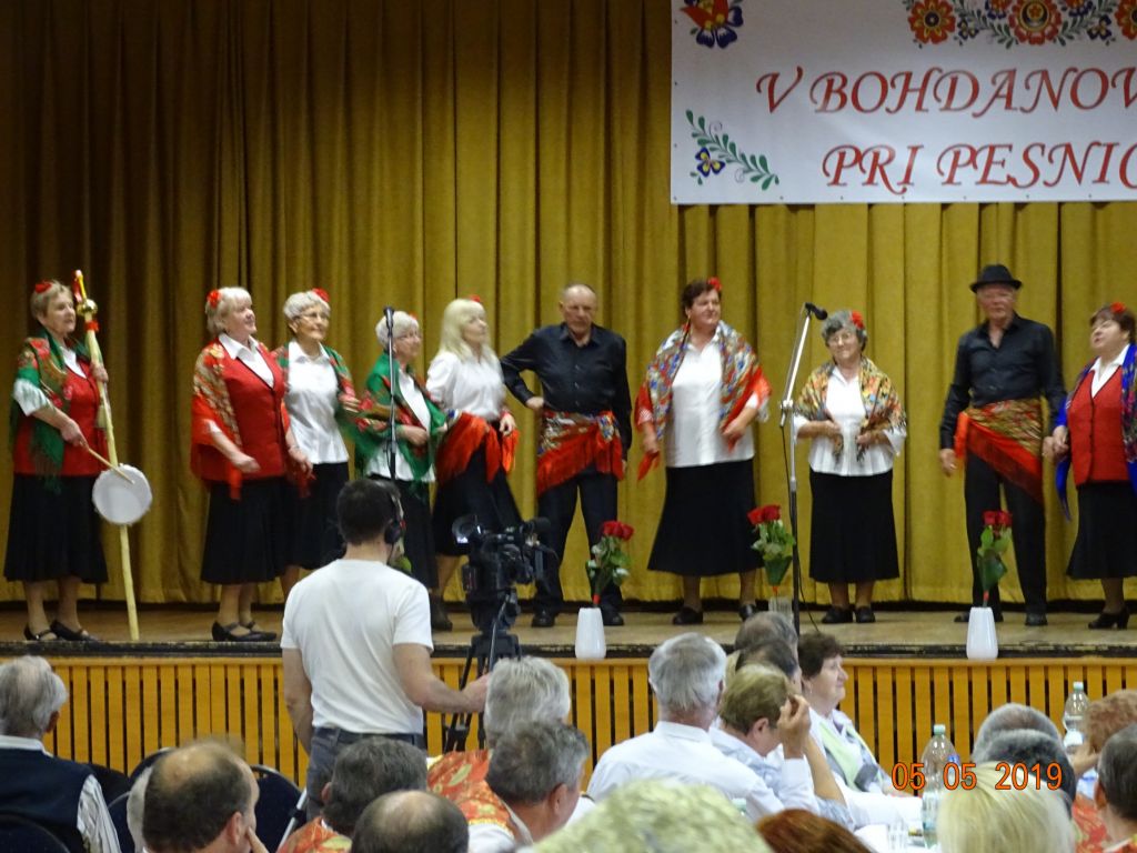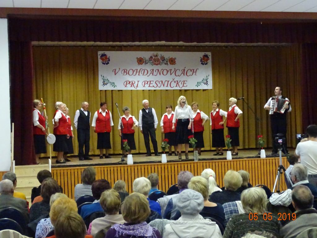 V „Bohdanovcách pri pesničke“ (05.05.2019) Všade bolo zamračené, ale v našom kultúrnom dome bolo jasno, no najmä veselo a spevavo. Pozvanie nášho súboru Bohdanovčan na IV. ročník posedenia pri ľudovej piesni prijali FS Seniorka Brestovany, mužská spevácka skupina Kátlovani Kátlovce, spevácka skupina Dolina Šelpice, spevácka skupina Šúrovčanka Šúrovce. Posedenie otvorili krásnou piesňou “Všade zamračené, nad nami je jasno” sólisti nášho súboru: Oľga Martišovičová, Nelka Duchoňová a Jakub Fajnor. Po príhovore nášho pána starostu Miroslava Sučáka nasledovalo žartovné vystúpenie Bohdanovčana. Vo svojom vystúpení uviedli aj novú pieseň “hymnu” Bohdanovce nad Trnavou. Seniorka z Brestovian sa predstavila zmesou ľudových piesní v doprovode s heligonkárom. Kátlovani v pekných krojovaných oblekoch zaspievali smutné i rezké pesničky, ich mužné hlasy rezonovali celým kultúrnym domom a náležite ich potleskom ocenilo publikum. Dojímavé piesne zazneli v podaní spevákov súboru Dolina, no veľmi potešila ich nová pieseň “Haj husičky haj, cez Šelpický háj”. Šúrovčanka sa nám predstavila v krásnych trnavských krojoch a zaspievala zmes ľudových piesní v rytme poliek a valčíkov. Záver však patril našim domácim spevákom, predviedli sa pásmom piesní, kde je slovo “cigán” či cigánskymi piesňami. Veru, úspech mali veľký a priviedli do “varu” celú sálu.