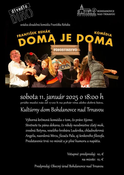 Divadelné predstavenie „Doma je doma“ (11.01.2025) aj naši seniori sa zúčastnili vtipného divadelného predstavenia, ktoré zabezpečil náš obecný úrad. Veru bolo aj načo spomínať, veď prvé dni skutočnej slobody a možnosť vycestovať do zahraničia prinášali aj komické situácie. Výborná partia ochotníckych a profesionálnych hercov, ktorí vďaka typickému dedinskému humoru zlepšujú náladu a pripomínajú komické chvíle v miestach, kde žijeme, priniesli aj k nám radosť a stretnutie mladých i tých starších. Divadlo DINO má sídlo v obci Horná Streda, neďaleko Piešťan. Ďakujeme, bolo to vtipné a veselé, toto ľudia potrebujú, tešiť sa z pekných chvíľ.